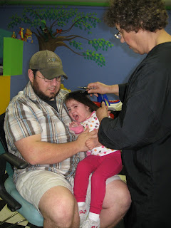 After almost 30 months of watching it grow.....we have finally had Roxie's hair cut! It was not fun, but it is done. It is much shorter than we were planning (and shorter than I verbalized to the woman who cut it) but it is said and done. Now that it is over Roxie seems happy with it (maybe she is just happy it is over??) and is even calling it pretty. Matt was very hesitant to have it cut at all. What's next.....him insisting that I grown my hair long? Not as long as there is beard growing going on in my house....to which I certainly did not agree to!